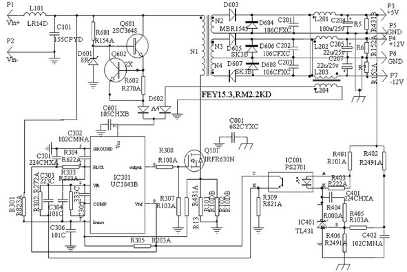 电源工作原理为:电路采用单端正激变换电路,当变换器接通电源时,输入直流电压经由电阻、12V稳压管D601和三极管Q601、Q602组成的电路稳压降压后, 启动UC3843进入正常工作,偏置绕组L204的供电电路开始工作,输出经A4和C601整流及滤波后输出12V电压,高于自供电电压,使二极管A4反偏,启动电路停止工作。变换器进入正常工作后,电源依据PWM脉宽调制方式工作,次级绕组的输出经过二极管整流以及电容器和电感器组成的LC型滤波器滤波后,产生所需的各路输出直流电压。+5V的输出电压由电阻器R402和R406分压后,与可编程稳压源TL431(U3)中的2.5V参考电压比较,然后通过光耦合器U2反馈到UC3843的2脚,控制脉冲的占空比,稳定5V输出。耦合电感L202和L203实现+/-12V两路稳压。过流保护电阻R101、R102检测到开关管的过流信号,送入3843的3脚,封锁UC3843的输出信号,实现过流保护。