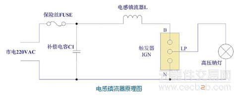 点亮后的灯等效电阻很小,灯压很低,而此时与灯串联的电感交流阻抗抑制了灯电流,防止电流过大对电路带来损害。随着时间的推移,钠灯两端的电压开始升高,灯的等效阻抗增大,电流慢慢的减小,最后达到其额定功率。由于电感的存在,有一部分的能量以电感绕线电阻发热和铁芯涡流损耗等方式被消耗掉,降低了整个电路的工作效率。