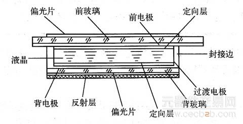 TN液晶显示屏的基本结构是:将涂有ITO透明导电层的玻璃光刻上一定的透明导电电极图形,将两片这种玻璃基板夹持一层液晶材料,四周进行密封,形成一个厚度仅为几微米的扁平液晶盒。由于在玻璃内表面涂有一层定向膜(也称配向膜),并进行了定向处理,盒内的液晶分子沿玻璃表面平行排列,且由于定向膜定向处理的方向互相垂直,液晶分子在两片玻璃之间呈90°扭转。因此TN液晶显示屏也称为扭转向列液晶显示屏。图1所示为TN液晶显示屏的基本结构示意图。