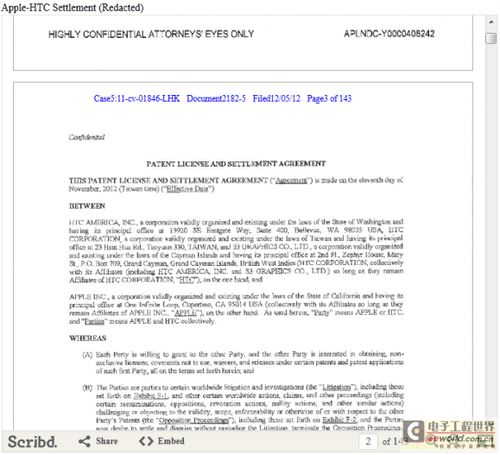 北京时间12月7日消息,据国外媒体报道,应苹果与三星专利案主审法官的要求,苹果与HTC专利纠纷和解协议内容今天已对外公开,但是专利授权的具体金额和专利费税率因保密问题则不需公布。