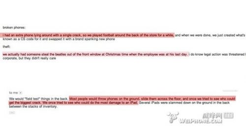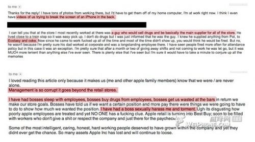 Gizmodo 称,他们收到了许多来自苹果零售店员工的匿名来信称,苹果零售店何止是管理不善,简直就是一个私人游乐场。iPhone 会被狠狠地击碎,如果有些员工为了自己高兴,还会直接从仓库偷走 iPhone。苹果零售店耀眼的光芒下其实也有它的阴影部分,完美永远都只是一个传说。